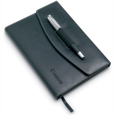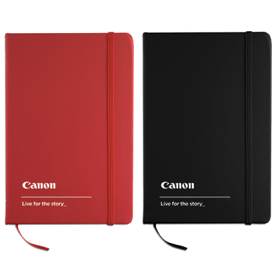 Black & Red notebook with white Canon logo, size A6 ("Live for the story" tagline optional)