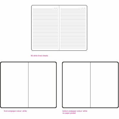 Block size approx. 130 x 209mm White paper 96 lined sheets with header field to write the date Front endpaper colour: white Rounded block and cover corners Hard (1.5 mm solid cardboard) Matt foil laminate finish Ribbon - black colour Rubber - black colour Pen loop - black colour