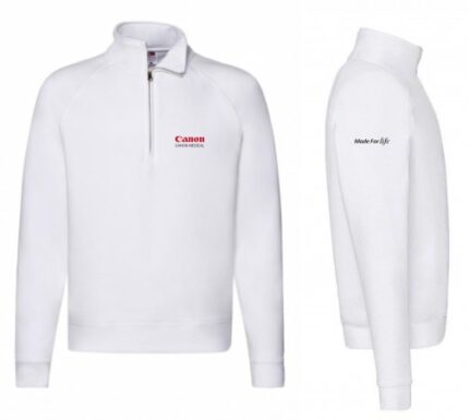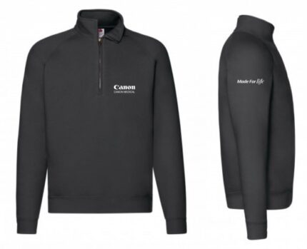 Fruit. Raglan sleeves  Collar with concealed metal quarter zip  Ribbed trim at cuffs and hem  Double seam at armhole and neck  Waist and cuff rib in cotton/elastane for shape retention Side seams. Material 70% Cotton, ring-spun, 30% Polyester  Weight 280 g/m² size S - 2XL Embroidery on the chest -  Canon Medical Embroidery on the sleeve  -  Made For Life Colours available: black & white.