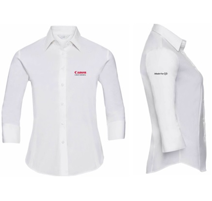 • White 3/4 Sleeve Shirt with red/black Canon Medical logo on chest and black Made for Life on sleeve.
